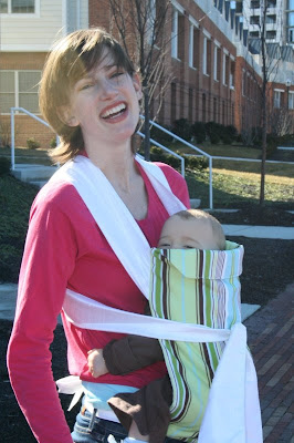 I discovered babywearing and attachment parenting while sifting through research on gentle birth options when we were expecting Benjamin. Everything about it seemed so perfect: the ability to create a strong bond with your child, the cognitive stimulation that your baby receives from being immersed in your world and everyday interactions, the love, happiness, and security that mommy and baby experience from being together, the independent child that will eventually emerge from the attached baby, the many opportunities for fashion self-expression through coordinating your new accessory with your outfit (ok, so this one wasn’t in my research, but hey…accessories are always good!)…I decided to give it a try, why not?